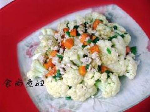 2.锅里放入油,倒入肉末炒散,倒入花菜,胡萝卜加盐再炒2分钟,起锅前撒入孜然粉和葱花即可。