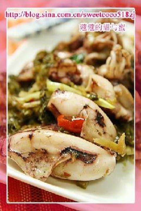 2.锅内油热后,倒入葱、姜、蒜煽出香味儿,倒入雪菜过一下油,加入焯过海兔、黄酒、 糖、干辣椒,翻炒几下,倒入几勺水,炒至汤汁收干即可。