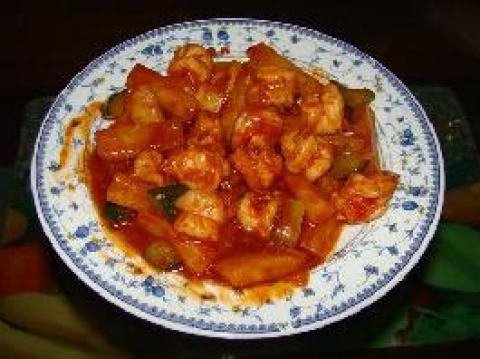 4.将多余的油倒出 留点底油 倒入番茄酱炒出红油 倒入虾球 山药段 翻炒 要是干就稍添点水 加上糖 少许盐 鸡精 出锅