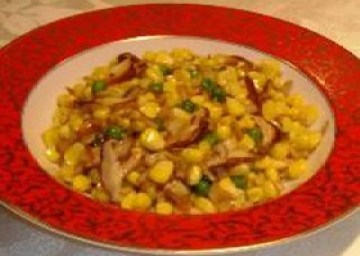 新鲜玉米粒300克,新鲜豌豆50克,新鲜香菇6个,菜油11/2汤匙,盐1/4茶匙
