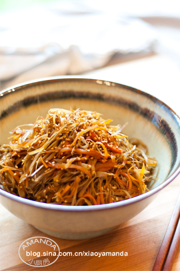 6、下沥干水的牛蒡丝略翻炒,再下胡萝卜丝。