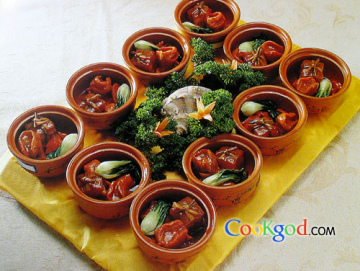 4、“兰花”蒸熟后围在肉的四周,勾芡浇在兰花上即成。