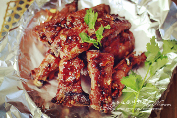 二、先用锡纸包住放入烤盘,用baking功能档烤25--30分钟,再取出来,用原来腌时剩下的汁加上两茶匙蜂蜜,调匀,涂在排骨表面,再用broil功能挡用低挡烤5--8分钟,两边烤,此时就密切注意箱内,开箱灯,不要烤得太焦哦。