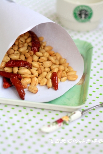 花生100克,辣椒干20个,花椒2克,盐1小匙,糖1小匙
