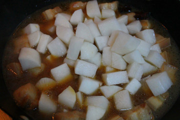 2、等肉八成酥时,放萝卜块,略放盐、糖(这菜略微偏甜点好吃),添水至块块们的一半,大火烧开转至中小火,至萝卜酥透即可撒上葱花,收汁出锅。
