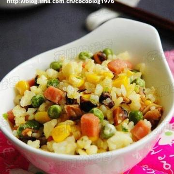1、 蔬菜洗净,胡萝卜去皮,和香菇一道切成小丁,豌豆和胡萝卜丁入沸水焯一下,捞出待用;