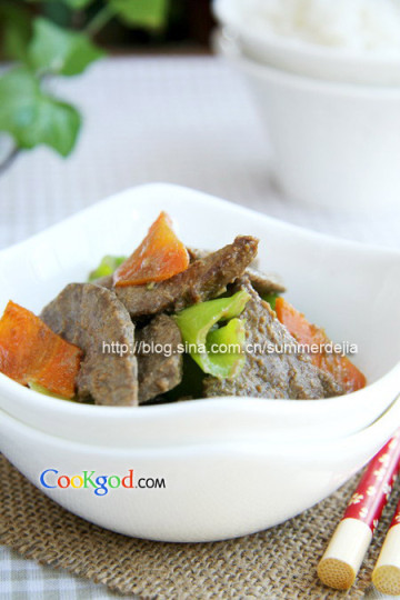 1、锅下香油先炒切好的圆葱,香味出来后放牛肉,肉变色后放西红柿,最后放青椒。
