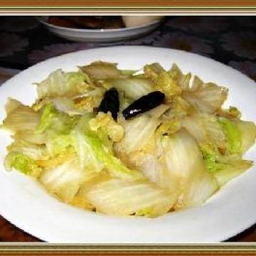 2、热油锅下辣椒和花椒,白菜炒断生,少放点米醋,盐和味精即可。
