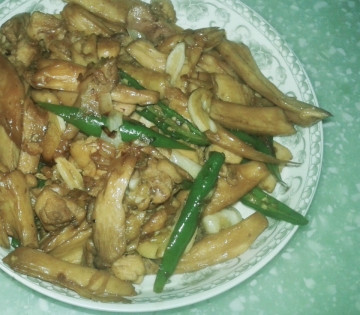 杏鲍菇切成菱形片 肉切片 葱切丝 肉片放淀粉料酒先腌一下 锅中放100克油油烧热放杏鲍菇 翻炒到杏鲍菇变软发黄捞出 锅中再放油按顺序放干辣椒(爱吃辣可以多放)放腌好的肉片翻炒变色放酱油 放杏鲍菇 盐 鸡精 翻炒几下放葱丝炒出香味就可以出锅了