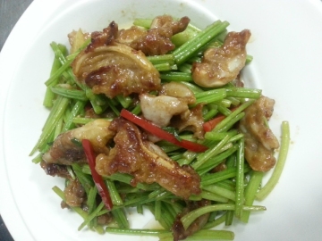 腐乳炒通菜、西芹炒肉片、清炒包菜。