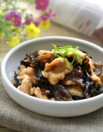 3、锅中放入油加热,加肉片炒至2分钟后加入木耳同炒,加上清汤、精盐焖上5分钟即可。