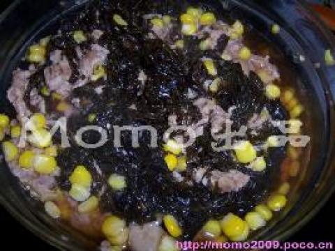 4.将紫菜、玉米、肉放入碟中,加入盐、生粉、料酒、生抽、油搅拌均匀腌2小时。