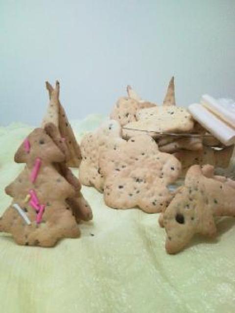 原方子的细砂糖是60g,我少放了些,觉得正好,因为黑芝麻酱里也有些糖分。而且这个饼干看上去很健康的样子,呵呵,男人说不错哦~~pp也意味是我买的饼干呢!