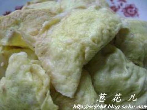 4.这样一个个做出来以后,在锅内少放油呛香葱,姜倒入高汤(没有那就开水吧)把做好的蛋饺倒入,用小火炖十分钟左右.这时如果肉馅咸了就多放点水,淡了就加点盐。