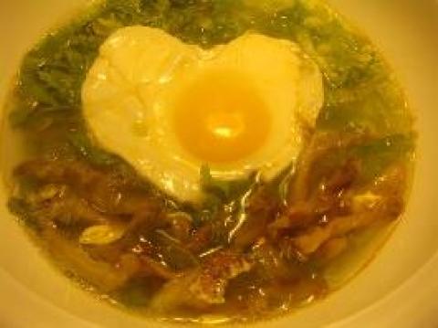 2.煮好后捞起冬粉放于碗内,铺上青菜丝,再放下蛋包后再用热汤淋下.食用时,可再多四川加辣酱或榨菜自选.