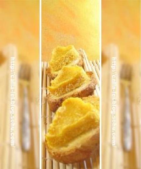 3.把拌好好的南瓜椰蓉泥用模具刻成心型,放在面包片上。