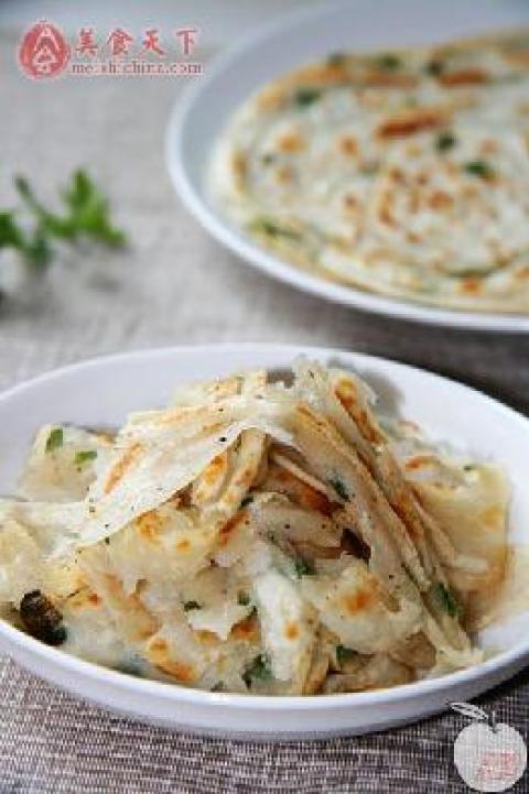 1.千层饼用手撕成一薄片一薄片的。