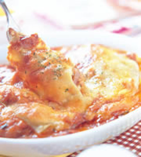 6、取一烤盘刷上一层薄薄的奶油后,依序放上一层面皮、一层作法3的肉酱、一层作法1的蕃茄酱、一层作法4的白奶油酱及洒上少许起司丝,重复前述作法共5次,再放入上火200℃、下火220℃的烤箱中烤约20―25分钟,表面呈金黄色即可。