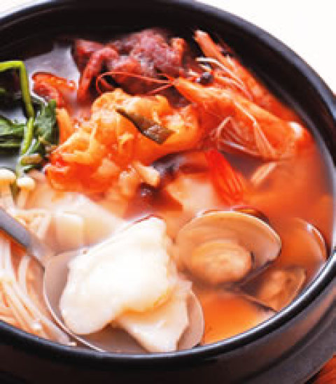牛肉片80公克,金针菇少许,麻油1大匙,牛骨高汤1500㏄,韩国泡菜150公克,虾3只,蛤蜊3个,鲜香菇1朵,面疙瘩150公克,酱油1茶匙,辣椒粉1/2茶匙,盐1/2茶匙,姜汁1大匙,米酒1茶匙,酱油1大匙,味醂1大匙,太白粉1大匙,全蛋1/2颗