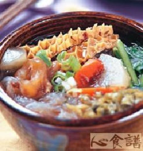 1.将牛蹄筋放入快锅中,加入红烧汤头及桂侯酱调匀,用小火慢炖约2小时。