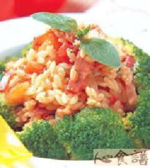 奶油40g,洋葱碎40g,培根切丝40g,煮熟义大利米粒面180g,烫熟绿花椰菜6朵,米兰番茄酱6大匙,起司粉适量
