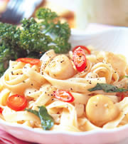 3.加入煮熟的义大利宽扁面与酱汁大火快炒1分钟。
