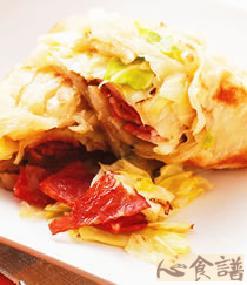 6.将培根切小片,以小火煎至略微焦脆后,加入高丽菜丝拌炒至软,放至作法5饼皮上,将饼皮捲起即可。