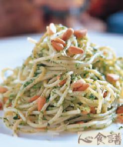 a.义大利面120g,松子数颗,起司粉少许,盐适量,b.鳀鱼罐头酱50g,帕马善起司120g,松子80g,橄榄油50g,罗勒叶320g