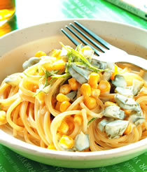 3.将义大利熟面和作法2的酱汁拌匀,再加入作法1的柠檬皮屑,最后撒上玉米粒即可。