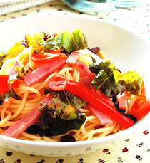 紫莴苣3叶,红甜椒10公克,小蕃茄2个,吐司火腿2片,熟义大利长面150公克,红酒醋3大匙,橄榄油1大匙,糖1/2茶匙,盐1/4茶匙