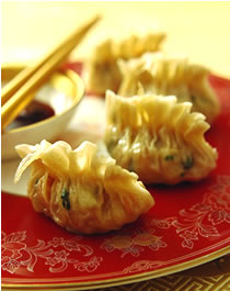 (2)取一张大白皮,包入适当的馅料,对折成饺子状,再用手折出花边,依序完成12个。放入蒸笼中,用大火蒸8分钟即可。