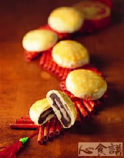 (5)将醒好的油酥皮压桿成圆片后,包入作法(4)的红豆沙年糕馅,接口捏合后稍压扁。