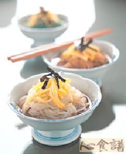 三色蒟蒻凉面200公克,海苔丝少许,蛋皮丝少许,荞麦面酱汁1/2杯