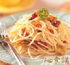 1.在煮滚的盐水(1%浓度)中加少许油,放入义大利面煮至9分熟后捞起备用。