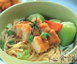 (4)将高汤放入锅中煮开,放入油面、青菜煮约3分钟,再以香油、盐、胡椒粉调味,最后将作法3的鸡排切块放置于汤面上即可。