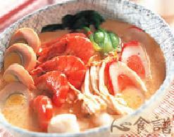 4.将草虾放入作法1的汤锅中煮熟,再加入鱼丸、鱼板、豆芽菜、金针菇及青菜煮熟后,倒入面碗中,放入白煮蛋即可。