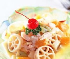 4.将所有水果丁与蟹管肉拌匀,并与优酪乳、柳澄汁、蜂蜜以及作法1的面条一同拌匀装盘即可。