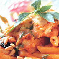 蒜泥1茶匙,新鲜蕃茄200公克,橄榄油3汤匙,洋葱100公克,通心面100公克,松子适量,鸡胸肉150公克,鲜奶油少许,辣椒粉少许,胡椒盐少许,起司粉少许,迷迭香少许,披萨起司少许,九层塔少许,橄榄油少许,蒜泥少许