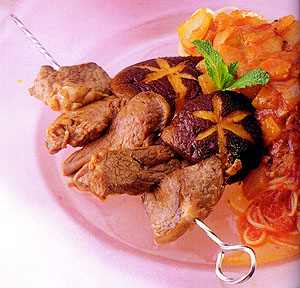 6、将意大利面、串肉、鲜香菇依序盛盘。