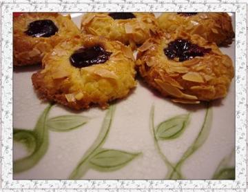 a.牛油50克,砂糖40克,蛋黄1个,b.低筋面粉100克,c.装饰:蛋白1个,杏仁碎20克,蓝莓果酱适量