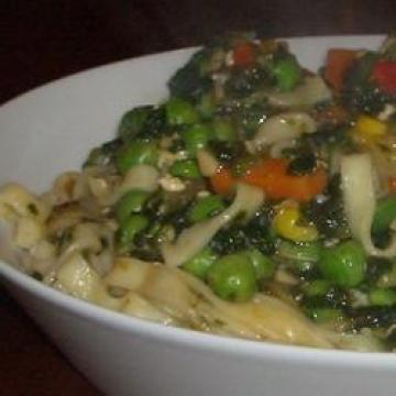 2.中火将油在锅里烧热。炒入蒜一分钟,再倒入菠菜,炒一分钟。然后加入煮好的鸡蛋面条,辣椒酱和西红柿酱,混合均匀。