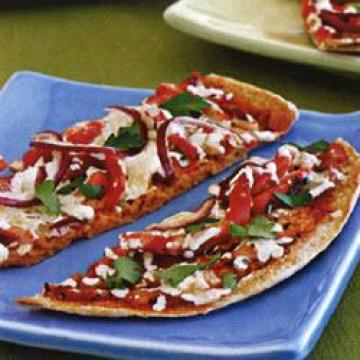 烤红甜椒半个,切成细条,磨碎的茴香籽或压碎的干奥勒冈(oregano)1/4茶匙,盐1/4茶匙,黑胡椒粉1/8茶匙,低脂意大利莫扎瑞拉(mozzarella)奶酪28克(约1/4杯),切成细条,瑞士格鲁耶尔(gruye)或亚尔斯堡(jarlsberg)奶酪14克(约2汤匙),切成细条,直径10厘米的全麦口袋面饼(pitabread)2个,瓶装西红柿酱或比萨酱8茶匙,小红洋葱1/2个,切成细洋葱圈