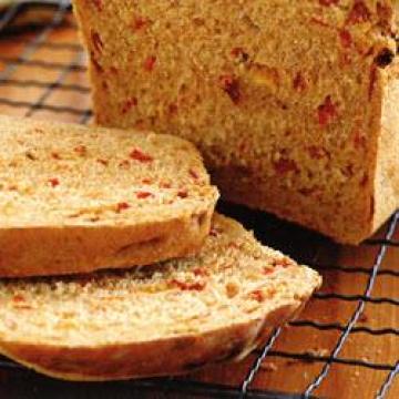 西红柿汁120毫升,橄榄油1汤匙,盐1茶匙,干迷迭香1/2茶匙,捣碎,大蒜2瓣,切末,活性干酵母1袋,黑麦面粉100克,中筋面粉260克,剁碎的西红柿干(非油渍的)45克