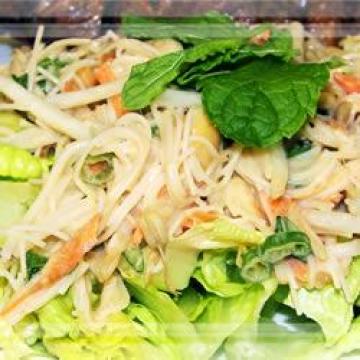 3.用一个大的色拉碗,把面条、黄瓜、豆芽、胡萝卜、葱花和薄荷混合。再倒进之前做好的混合色拉酱,拌匀。用生菜叶垫底,冷冻后,用花生仁作装饰即可。