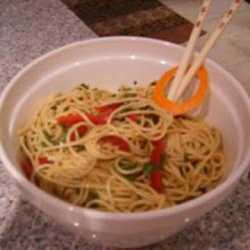 细面条或鸡蛋面250克,芝麻油2汤匙,酱油少许,辣椒面1/2茶匙,红椒1个,切丝,香菜1小把,切碎