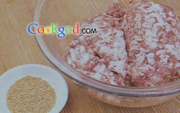 2、将猪肉用清水洗净,剁成茸,加食盐、核桃仁粉、酱油、胡椒粉、生姜末拌匀,加适量的水搅拌成糊状,再放入葱花、人参粉、香油,拌匀成饺子馅。