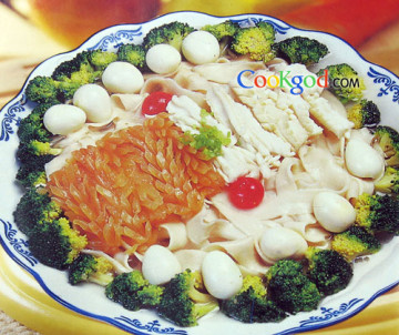 精粉500克,水250克,蛋清2个,鱿鱼200克。辅料鹌鹑蛋10个,西兰花100克,车厘子50克。调料精盐、味精、鸡精粉、花生油、香油、花雕酒、花椒、生抽、陈醋、葱花、姜末、蒜丝、高汤各适量。