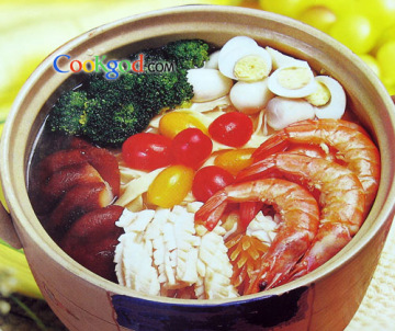 2、和面:先将面粉倒入盆内加入鸡蛋、水和成硬面团,盖湿布稍饧,把饧好的面团放在案板上,用擀面杖擀成薄面片,切成韭菜宽的面条,下入开水锅内煮熟捞出控出水分,冉下入油锅内炸成面饼状后放入沙锅中。再在沙锅中加入高汤、精盐、味精、酱油、香醋、料酒、白糖、葱丝、姜末、蒜片,摆上鱿鱼卷、圣女果、西兰花、香菇片、熟大虾上火略烧开后略煮即可撤锅,食用时就锅吃面,以锅代碗即成。