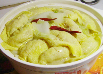 步骤4:出水就可以把蛋饺下去共同中火烧个4,5分钟就好了,但天冷了,为了保温,我用了砂锅,所以把白菜转移到砂锅里了,然后一个个把蛋饺放到白菜上。