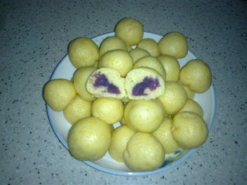 2、里面的馅是紫薯泥,把紫薯蒸熟捣成泥做成馅料;